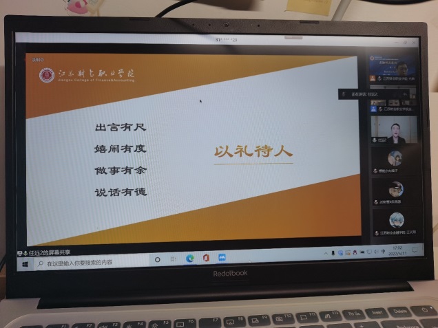 2022年5月11日下午,培训在腾讯会议如期进行,金融理财达人社团的同学们来到财商学院教学楼集体参加了会议。培训由江苏财会职业学校张维校长主持,主讲嘉宾为任远。任远老师是资深的银行礼仪专家,担任着中国银行江苏省分行内部培训师、上海进博会志愿者培训核心讲师、上海市文明办“市民修身”礼仪指导师、上海对外经贸学院国际礼仪客座教授、上海视学艺术学院社交礼仪与媒体公关讲师等职,她以“商业银行礼仪要领”为主题,从职业素养与服务意识、职业形象塑造、职业行为规范等方面展开讲授。