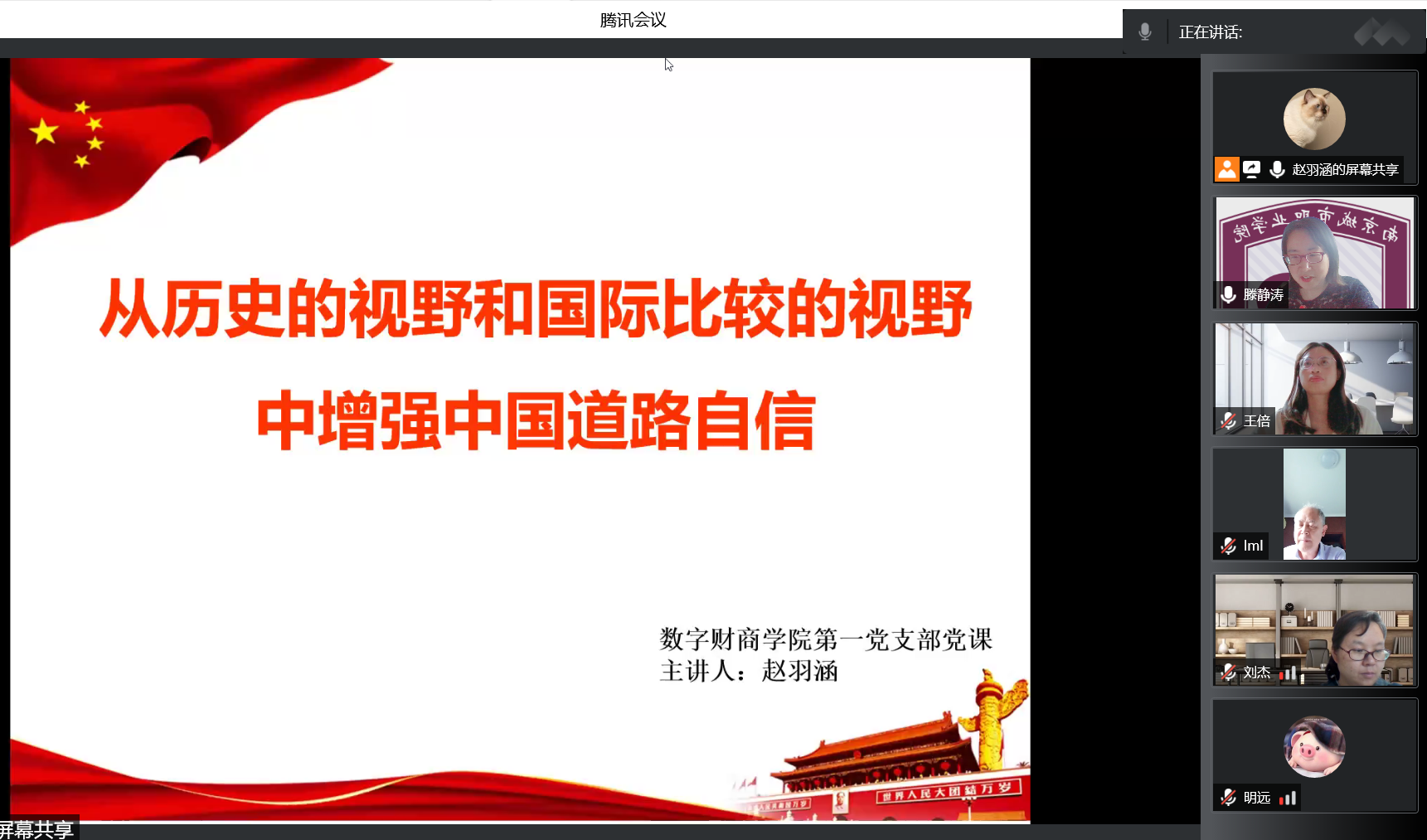 为深化党员师生对中国特色社会主义理论体系的学习,在校园疫情防控阻击战中坚定众志成城,同心抗疫,5月10日下午,米兰平台第一党支部应用“腾讯会议+超星网络课程”举办了“从历史的视野和国际比较的视野中增强中国道路自信”的专题党课。本次党课由支部书记滕静涛老师主持,宣传委员赵羽涵老师主讲,支部全体党员师生参加学习。
