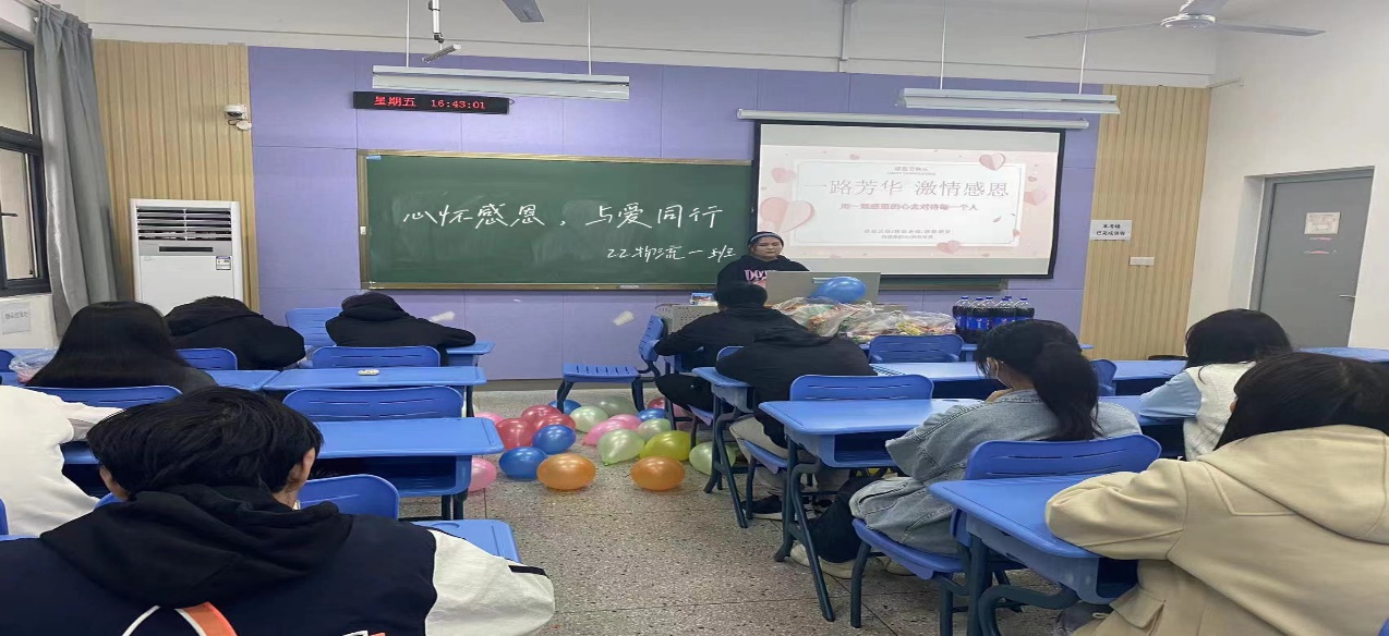 为了积极响应感恩节“一路芳华、激情感恩”的主题,班长对本次举办感恩节的目的以及感恩节的由来进行了详细的介绍。杜甫的诗词中曾写过“报答春光知有处,应需美酒送生涯”, 感恩是用一颗感恩的心去对待每一个人,通过自己的行动去告知每一个人,也许是你不经意间的微笑,又许是你一个善意的小动作,即使微小,但很有意义。随后班长播放一段视频,内容简述的是一位带着母亲去“上课”的老师,母亲患有老年痴呆,老师选择让母亲在学校方便照顾,但同时给学生造成了影响。通过一段六分钟的小视频,我们知道当我们一天天的长大,父母也在一点点衰老,原本的青丝已变成白发,老人家期盼的无非是儿女的陪伴。她强调感恩与爱同行,物质上的满足有时不如你一个电话或者一句问候让人暖心。活动中团支书建议班级同学活动后给家里人打个电话聊聊天。