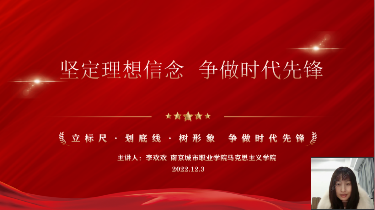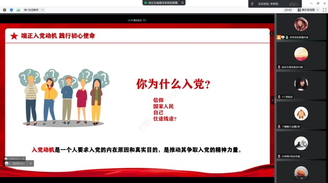 为进一步端正同学们的入党动机,坚定加入中国共产党的信念,米兰平台于2022年12月3日开展了党课培训的第三讲“坚定理想信念,争做时代青年”。本次主讲教师为我院兼职辅导员李欢欢老师,160多名学生通过腾讯会议线上参加了党课学习。