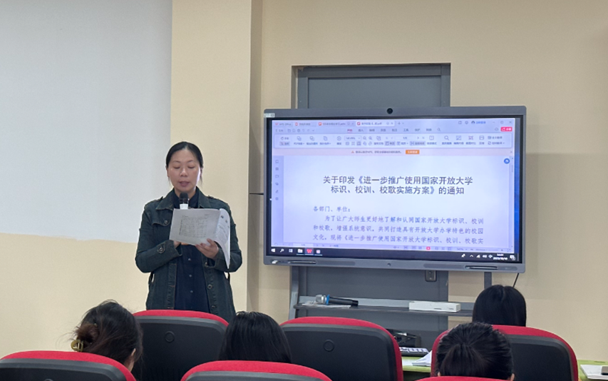 接着,党总支宣传委员高洋带领大家学习了学校《关于印发〈进一步推广使用国家开放大学标识、校训、校歌实施方案〉的通知》(宁开大〔2023〕15 号),从指导思想、主要目标、主要任务、相关要求等几个方面让全院教师更好地了解和认同国家开放大学标识、校训和校歌,增强系统意识,共同打造具有开放大学办学特色的校园文化。大家还兴致勃勃地一起欣赏和学唱了《国家开放大学校歌》。