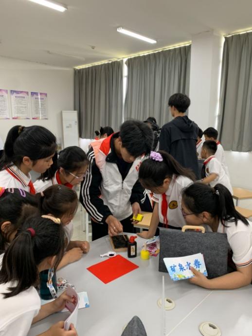 在交子模具拓印制作环节,同学们听老师和志愿者们介绍了交子的历史由来,观看拓印制作示范,并在志愿者的指导下体验了刷墨、铺纸、按压等拓印过程,拓印制作过程并不复杂,但需要耐心和细心,有的同学为了能拓印出完美清晰的图案,用力地按压敲打,专注的神情让人忍俊不禁!