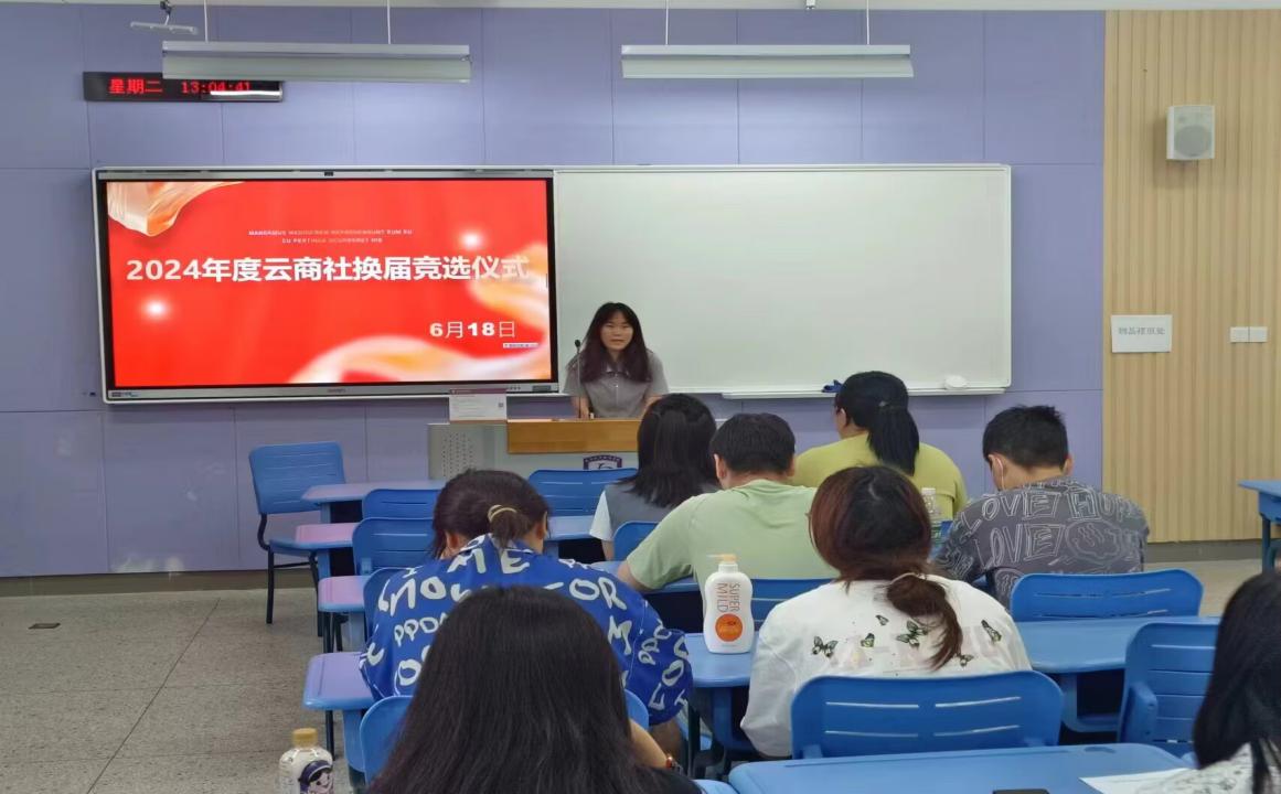 2024年6月18日,云商社在厚生楼319教室隆重举行了2024年换届选举。指导教师和云商社在社成员共同参加了换届选举活动。此次活动不仅为社团注入了新的活力,也标志着云商社即将迎来新的发展阶段。