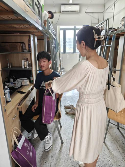 走访前,支部书记滕静涛细致地分配好每一位党员老师走访的宿舍号,祁春华、高洋、甄宗波三位辅导员提前把走访宿舍时发放给学生的T恤及宣传册分装好,并在袋子上细心标记好一间宿舍每一名学生的姓名、尺码。中午12:30,党员老师们来到学生宿舍发放T恤、宣传册,并与新生亲切交流,询问他们对校园生活有什么疑惑与困难,给予相应的指导。看着18、19岁的学生们楼上楼下奔忙着,满怀喜悦地憧憬即将到来的大学生活,老师们汗水淌在背上,笑容溢在脸上,都说今天教师节过得真有意义。当天,支部党员教师共计走访67个宿舍,看望近400名小萌新。希望通过党员教师的走访活动,帮助我院新生更好地适应大学生活,促进学生全面发展与健康成长。