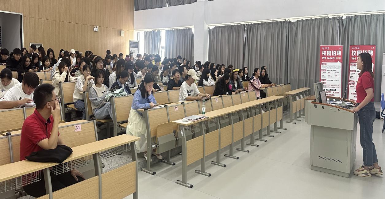宣讲会现场座无虚席,气氛热烈而充满期待。南京小红岛超市的梁女士和顾总作为演讲嘉宾,以他们丰富的人生阅历和创业故事,迅速吸引了同学们的注意力。