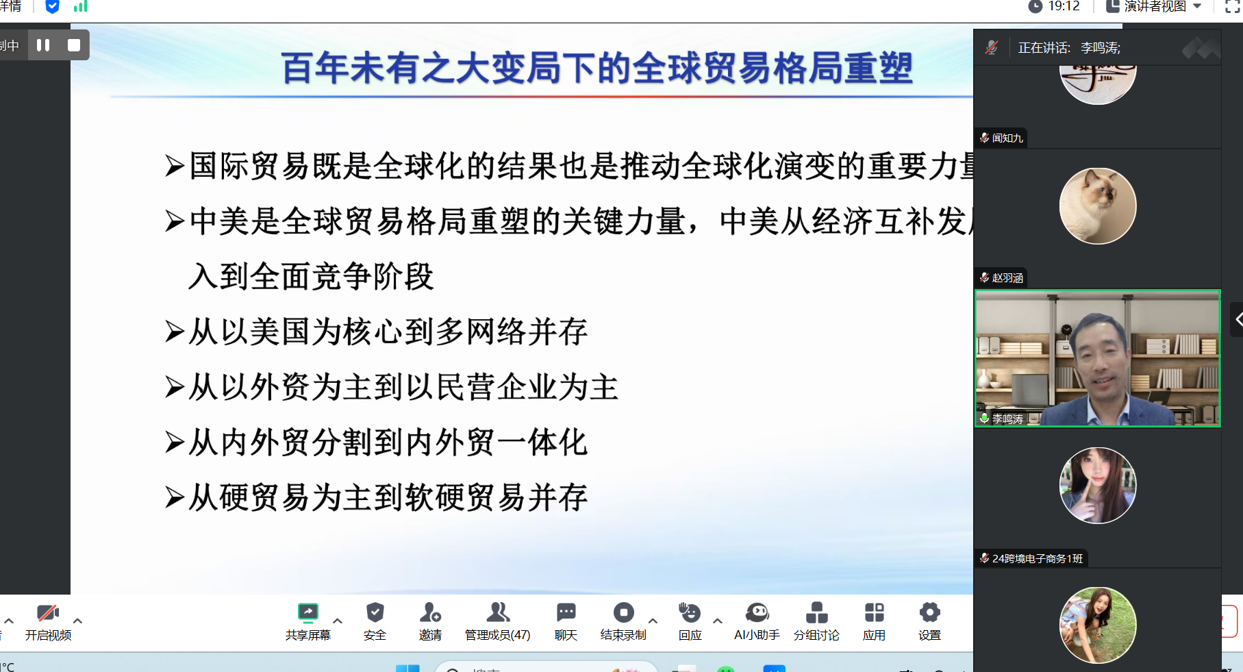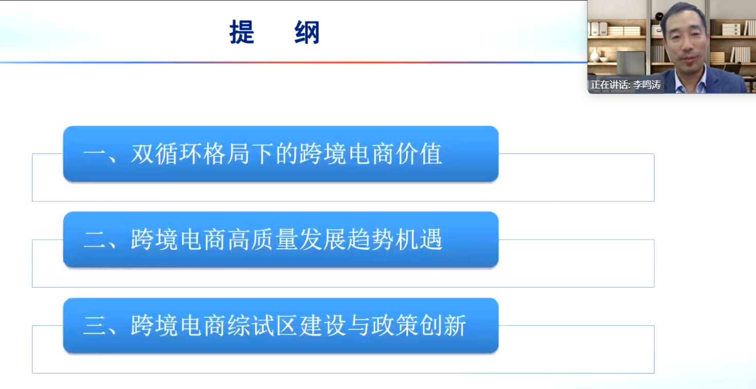 为正确把握资源库建设方向,推动省级跨境电子商务专业教学资源库建设及应用推广,数字财商学院特邀请资源库首席顾问李鸣涛教授于2024年11月14日晚,开展主题为“外贸大变局中看跨境电商新价值、新机遇与新政策”的学术讲座。江苏省职业教育跨境电商专业教学资源库参建教师代表、跨境电子商务专业部分学生共计200多人以自主或集中方式聆听了本次在线讲座,资源库主持人、我校党委委员、副校长江景参加活动并讲话,米兰平台书记、院长刘红主持讲座。