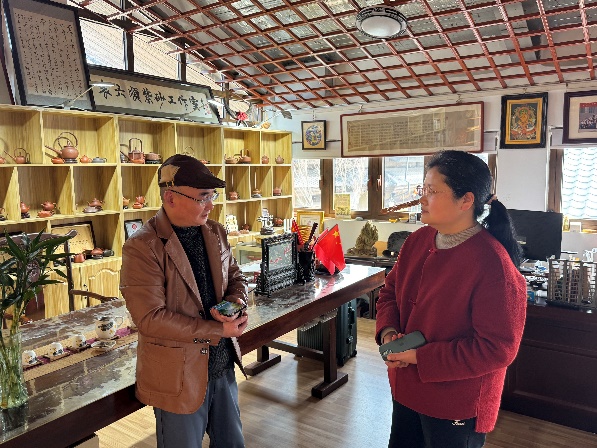 袁六顺非遗研创中心是溧水区重要的非物质文化遗产保护、体验、传承、研学、创新平台,汇聚了紫砂陶艺、木雕、面塑、剪纸、刺绣、虎头鞋等众多优秀非遗项目,致力于提升和推动溧水当地非遗技艺的发展。中心负责人袁六顺目前是中国传统工艺美术大师,在他的陪同下,师生们先后参观了非遗展厅、传承人工作室、文创产品展示等,近距离感受了非遗文化的独特魅力和精湛技艺。参观过程中,袁总介绍了中心的创办过程和对地方文化传播的意义,并详细讲解了陶艺制作的历史渊源、文化内涵和技艺精髓。师生们认真聆听,积极互动,深刻体会到了非遗传承人精益求精的工匠精神和坚守传承的文化情怀。