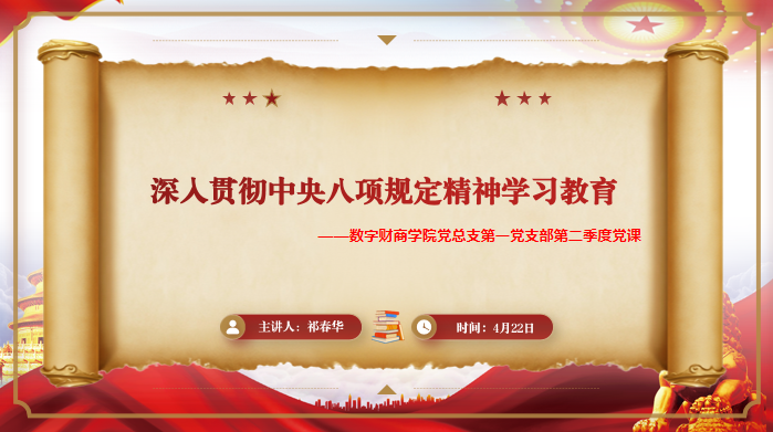 4月22日下午,米兰平台党总支第一党支部在厚生楼303教室举行了第二季度专题党课。本次党课由支部组织委员祁春华老师主讲,主题为“深入贯彻中央八项规定精神学习教育”,支部党员参加了学习。