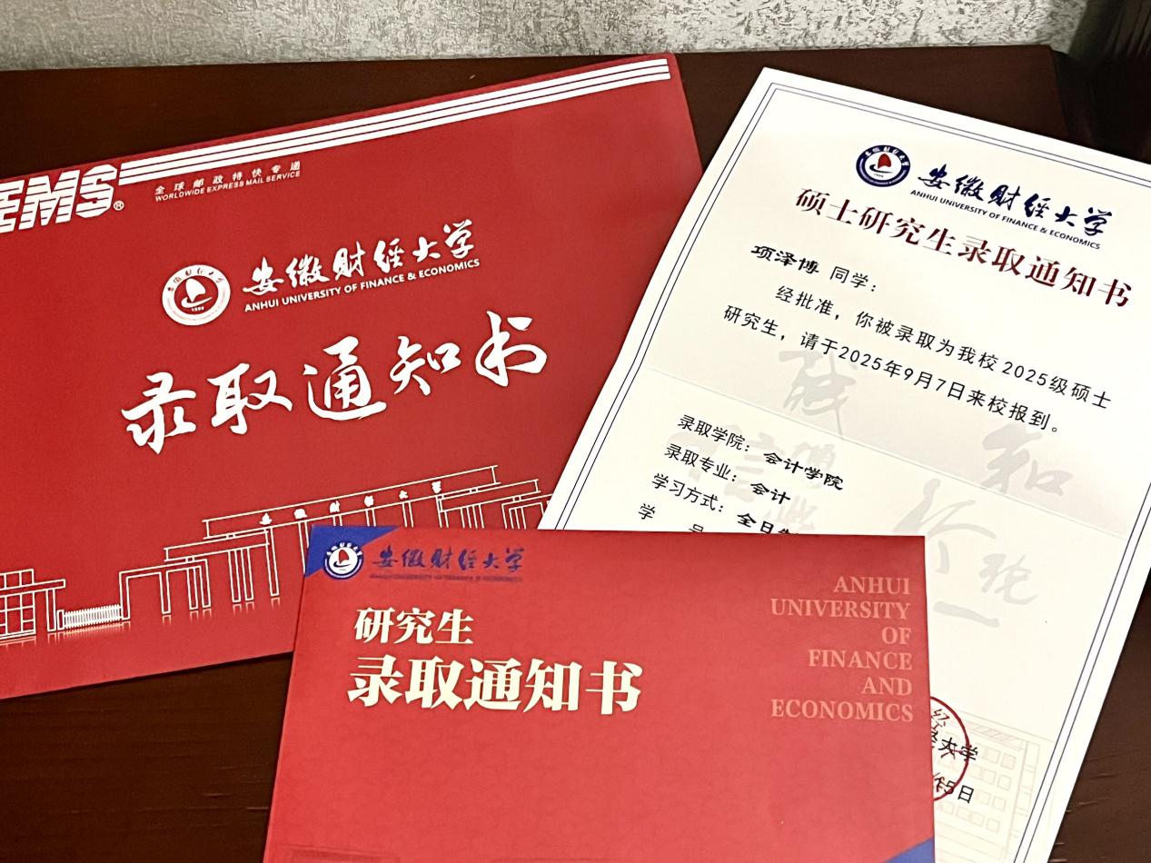 近日,米兰平台2023届大数据与财务管理专业毕业生项泽博同学传来喜讯!历经专转本升入江苏科技大学后,他坚持不懈,最终成功考取安徽财经大学会计专业硕士研究生!