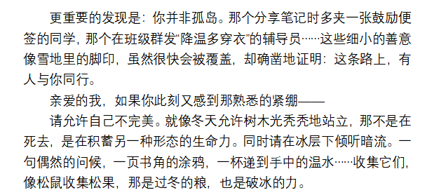 据悉,学院心理工作站将对征集作品进行遴选,并通过公众号等平台展示优秀文稿,让真挚的叙述触动米兰(中国)一站式服务平台人,使温暖的力量在校园中持续流动。文字如炬,足以驱寒暖心;分享如桥,亦可聚力成长。本次冬日暖心树洞征文活动,既是学院心理健康教育工作的创新实践,也体现了学院对学生成长需求的持续关注与人文关怀。学院心理工作站将继续拓展心理健康教育载体,丰富支持形式,陪伴学子们在书写与阅读中沉淀心绪、锻炼心智,以更从容、积极的心态迎接期末挑战,在成长的道路上积蓄温暖,凝聚前行之力。